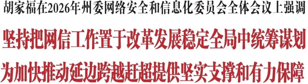 4月13日,省委常委、州委書記、州委網(wǎng)信委主任胡家福主持召開2026年州委網(wǎng)絡安全和信息化委員會全體會議。他強調(diào),要深入貫徹習近平總書記關于網(wǎng)絡強國的重要思想,立足邊疆民族地區(qū)對網(wǎng)信工作的特殊要求,堅持把網(wǎng)信工作置于改革發(fā)展穩(wěn)定全局中統(tǒng)籌謀劃,以更加務實舉措推動網(wǎng)信事業(yè)實現(xiàn)新提升,為加快推動延邊跨越趕超提供堅實支撐和有力保障。