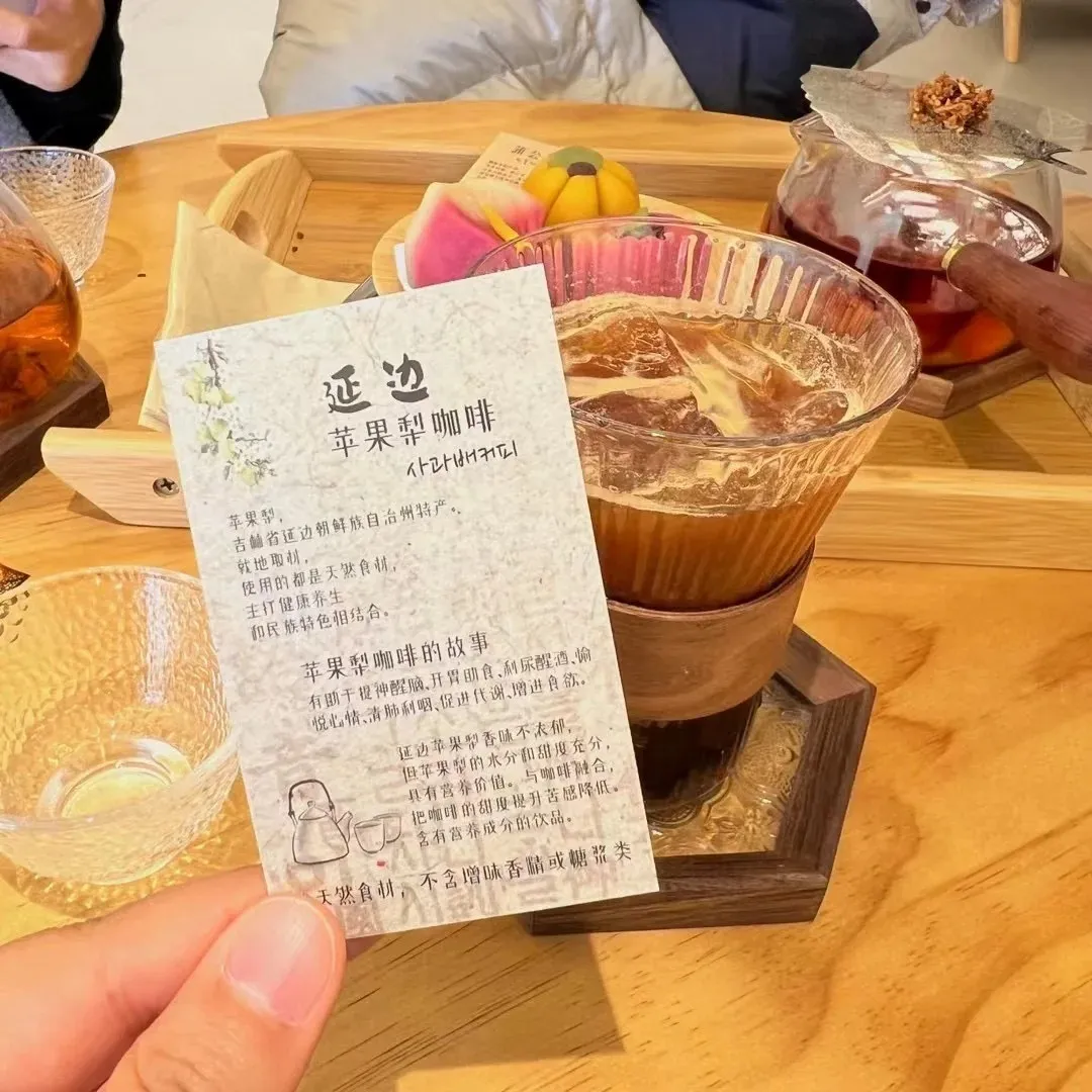 必嘗風(fēng)味:延吉特有的“蘋果梨咖啡”。蘋果梨是延邊的特產(chǎn),清甜的梨汁中和了咖啡的苦澀,這是只有在延吉才能喝到的地道風(fēng)味。