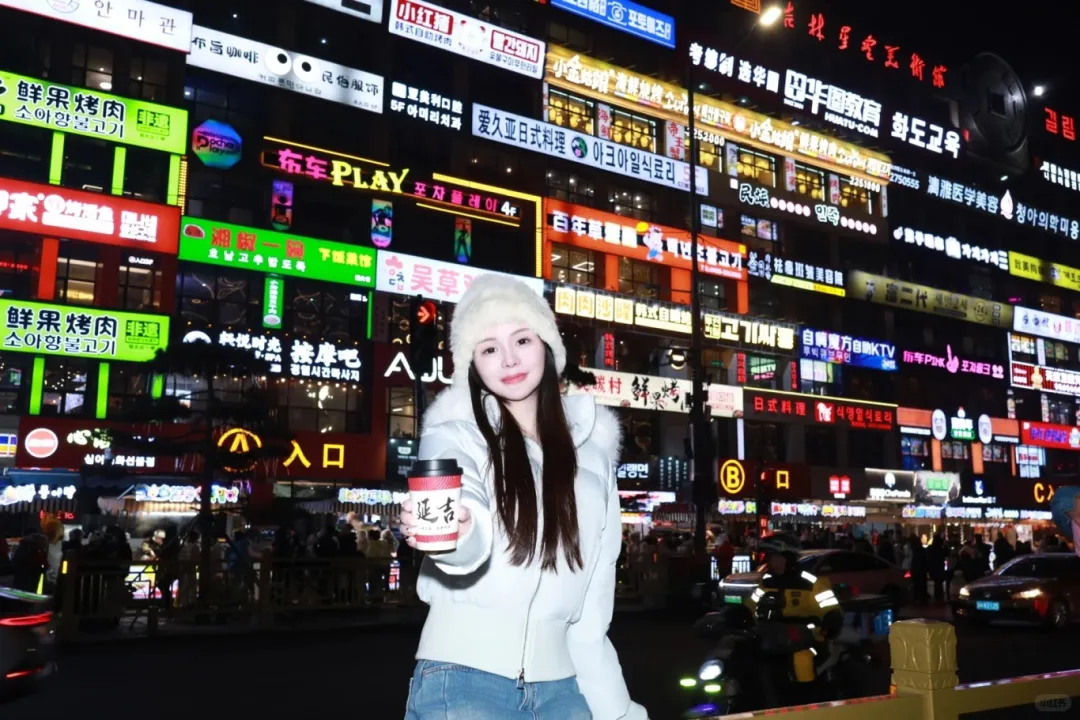尤其是夜晚亮燈后,暖黃、火紅、湛藍(lán)等各色燈光與雙語(yǔ)牌匾交相輝映,氛圍感直接拉滿。手持一杯印著“延吉”logo的咖啡,與網(wǎng)紅彈幕墻同框,打造專屬的延吉打卡記憶點(diǎn)。